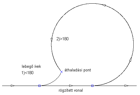 A csatolási elem (1) és az áthaladási pont (2) határozza meg az ív sugarát. Az ilyen típusú íveknek nem lehet módosítani a sugarát.