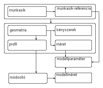 A következő ábra mutatja be a modellt alkotó alakzatokat. A nyilak jelölik az alakzatok közötti kapcsolat irányát. Egy geometria módosítása például hatással van a hossz-szelvényre, amely hatással van a módosítókra, és így tovább. Ez az ábra segíthet a későbbiekben megérteni az alakzatok közötti kapcsolatokat, ahogy egyre inkább megismeri őket.