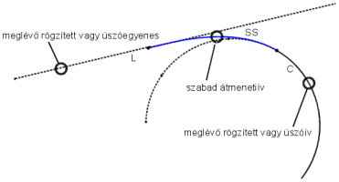 A következő ábrán egy olyan egyenes és ív közötti szabad átmenetiív látható, amelynek a létrehozásánál előbb az egyenes lett kiválasztva: