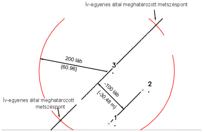 A metszéspontok egy ív, melynek a sugara 200, és a középpontja a 3. pont, valamint egy az 1. és a 2. pont közé rajzolt vonal, melynek az eltolási távolsága 100 balra, között találhatók.