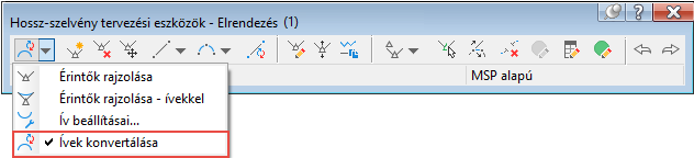 A parancs kiválasztása után megjelenő parancssori beállítások használatával megadhatja a konvertálni kívánt ívtípusokat. A Szabad magassági lekerekítés (parabola) parancs használatával létrehozott szabad magassági lekerekítések vagy a Rögzített magassági lekerekítés (parabolikus, tetőpont/fenékpont, paraméter, hosszúság) parancs használatával létrehozott rögzített magassági lekerekítések konvertálhatók.