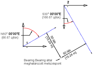 Egy metszéspont található az 1. ponttól megrajzolt N66.6667"E bearing irányszög, melynek eltolási távolsága 50 láb jobbra, és a 2. ponttól megrajzolt S33.3333"E irányszög, melynek eltolási távolsága szintén 50 láb jobbra között.