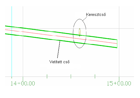 A hossz-szelvény vagy keresztszelvénynézetet keresztező vagy metsző csővezetékeket a program csőkereszteződésként jeleníti meg.