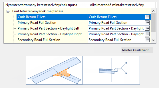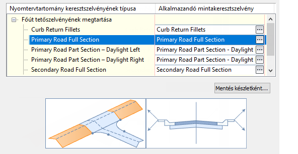 Amikor például a „Főút teljes keresztszelvénye” nyomtervtartományt választja ki a Csomópont nyomtervtartományai párbeszédpanelen, a következő grafikus ábra jelenik meg, jelezve ezen tartomány helyét a nyomterv mentén.