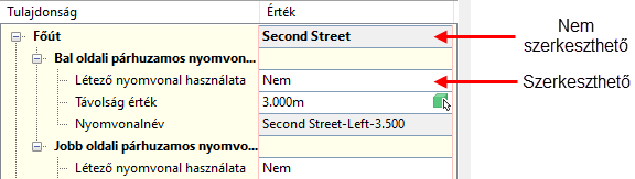 A jobboldali párhuzamos nyomvonal ki van jelölve a Csomópont eltolási paraméterei párbeszédpanelen, ahogy az a bal oldalon látható. A rajzban a program kiemeli a párhuzamos nyomvonalat.