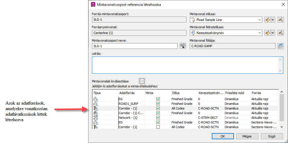 A folyamat során nem jelennek meg az egyes adathivatkozás-referenciák létrehozásával kapcsolatos párbeszédpanelek. A referenciák létrehozásához használt alapértelmezett beállításokat a Mintavonalcsoport-referencia létrehozása parancs futtatása előtt lehet megadni, a megfelelő parancsbeállítások, például a CreateSurfaceReference, a CreateProfileReference, a CreateNetworkReference és a CreateCorridorReference használatával.