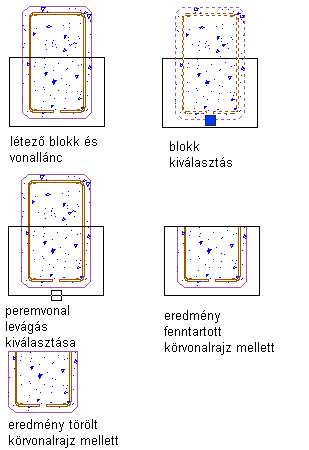 lehetőséget. Minden, a vágás határvonalán kívülre eső eredetileg kijelölt vonalrajz törlődik. Ha a levágás határvonalának törlését választotta, a határvonalak újrarajzolódnak minden zárt körvonalú elemnél a levágás területén belül. De minden nyitott körvonalú objektum, amelyből levágott, nyitott is marad.