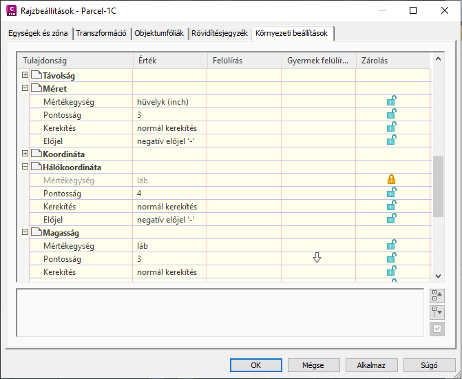 A Környezeti beállítások lapon egy nyíl jelenik meg a Gyermek felülírása oszlopban minden olyan beállítás mellett, amelyet legalább egy rajzbeli alakzat (objektum) esetében módosított. A nyílra kattintva visszavonhatja a felülírást, és a zárolás ikonra kattintva zárolhatja a beállításokat, és megakadályozhatja az alakzat szintű felülírásokat.