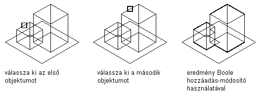 A Boole kapcsolódás módosító két alakzatot ad össze, és így hoz létre egy alakzatot. Ez a módosító az összeadás alapkoncepcióját használja: egy geometrián belüli geometria összeadáskor eltűnik. Ez a módosító akkor hasznos, ha olyan alkatrészmodelleket hoz létre, amelyek a rajzba illesztve ugyanúgy kell, hogy kinézzenek, ahogy a modellben létre lettek hozva.