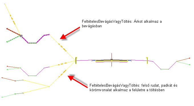 Egy feltételes nyomterv mintakeresztszelvény például két FeltételesBevágásVagyTöltés alkotóelemet tartalmazhat. Az első FeltételesBevágásVagyTöltés alkotóelem konfigurálható úgy, hogy árok alkotóelemet alkalmazzon, ha van vágási feltétel. A második FeltételesBevágásVagyTöltés alkotóelem konfigurálható úgy, hogy mellvédet, padkát és körömvonalat alkalmazzon a felületre, ha van töltési feltétel. Feltételes alkotóelemekkel csökkentheti a fenntartandó nyomtervtartományok és mintakeresztszelvények számát.