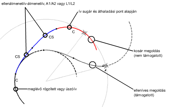 A két átmenetiív ellentétes irányba görbül. Az ív a csatolási ívvel ellentétes irányba görbül. Ha szerkeszti a csatolási ívet (1), az átmenetiívek hossza (2, 3) és az áthaladási pontok (4, 5) nem változnak. A csatolási pont és az ellenív hossza és sugara megváltozik, alkalmazkodva a csatolási ív szerkesztéseihez.