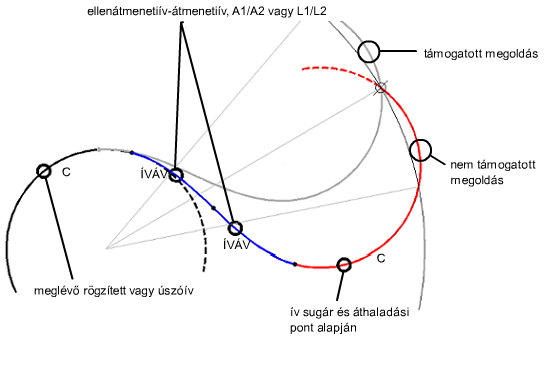 Meghatározott sugarú és áthaladási pontú úszó ellenátmenetiív-átmenetiív-ív csoportot adhat egy ívhez.
