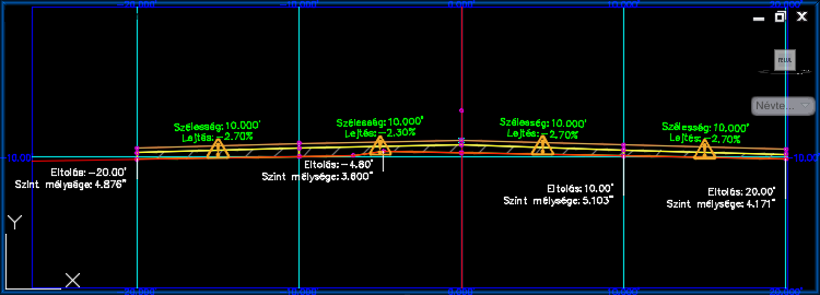 Osztatlan felújítási nyomterv keresztszelvény esetén a Módosított magasság egyenlő a tetőpont magasságával a kiválasztott szelvényen.