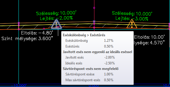 Ha a javított esés két szelvény közötti változása a szelvények közötti hossztávolsághoz viszonyítva nagyobb, mint a maximális relatív átmenet, hiba jelenik meg.