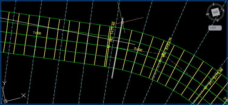 Amikor kiválaszt egy felújítási nyomtervben lévő felújítási tartományt, három alapértelmezett nézetablak jelenik meg, így megtekintheti a szelvény nyomterv keresztszelvényét (keresztszelvénynézet), a szelvény függőleges hossz-szelvényét (hossz-szelvény nézet), és a nyomterv keresztszelvény elhelyezkedését a felújítási nyomterv nyomvonala mentén (helyszínrajzi nézet).
