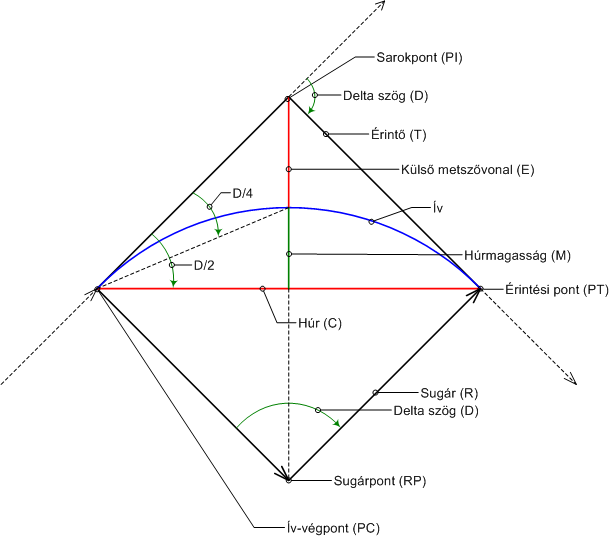 A következő ábra az Autodesk Civil 3D által használt ívparamétereket jeleníti meg.