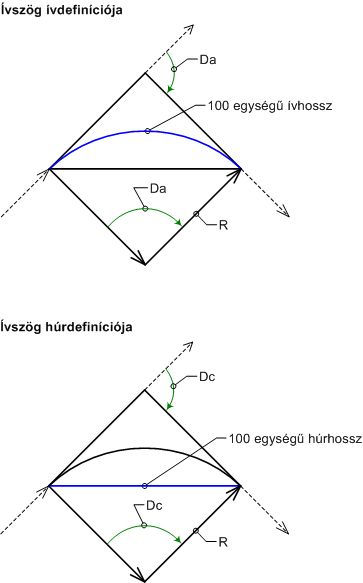 - Húr definíció: Megadja, hogy a görbület szögét a húr határozza meg. Ezt a beállítást vasútívek esetén használja. Vasútívek esetében a görbület szöge egy 100 egységnyi húrhoz tartozó központi szög.