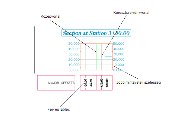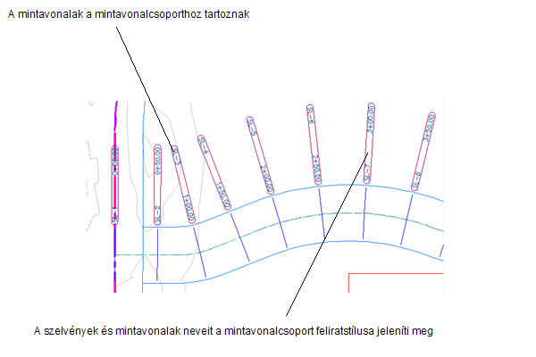 Ha egy nyomvonal mentén hoz létre mintavonalakat, akkor adott létező vagy javasolt felületekhez, nyomtervmodellekhez vagy csőhálózatokhoz is létrejönnek keresztszelvény-objektumok. Az egyes mintavonalak alapértelmezett stílusait és minta objektumait egy mintavonalcsoport határozza meg. Más minta objektumok is hozzáadhatók a mintavonalcsoporthoz a mintavonalak létrehozása után. A rajz keresztszelvényeinek nyomtatásához hozzon létre egyedi vagy többszörös keresztszelvénynézetet.