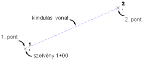 A kiindulási vonal az 1. ponttól a 2. pontig tart. Az 1. pont beállítása a 1+00 szelvény. Az irányok és távolságok az aktuális mértékegységben vannak megadva, hacsak nem billentyűz be egy minősítő utótagot.