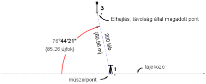 A 3. pont egy 85.2657 iránytörés szögnek az átfordításával, a tájékozó vonal kiterjedésétől jobbra 200 egység távolságban kerül elhelyezésre. A szögek és távolságok az aktuális mértékegységben vannak megadva, hacsak nem billentyűz be egy minősítő utótagot.