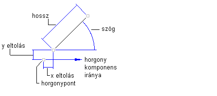 - Kezdőpont, Hossz és Szög: Ezzel a módszerrel lehet a vonal kezdőpontját a horgonykomponenshez horgonyozni. Ezután adja meg a hosszt és a szöget. Az alábbi illusztráció egy ezzel a módszerrel meghatározott vonalat tartalmaz.