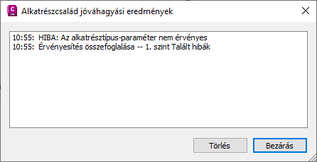 Amennyiben a modell tartalmaz hibákat, az állapotsorban megjelenik egy üzenet, amely jelzi, hogy nem sikerült az érvényesítés, és megjelenik egy párbeszédpanel, amelyben ki vannak listázva a hibák. Javítsa ki a hibákat, végezze el a szükséges módosításokat, és ismételje ezt a lépést mindaddig, amíg nem sikerül az alkatrész érvényesítése.