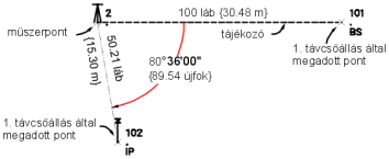 A 102 számú pont 89.5370 vízszintes szögnek az 1. távcsőállástól jobbra történő elfordításával és a műszerponttól 15.304 távolságra lévő 101.2052 függőleges szögnek a használatával van elhelyezve, és a leírása IP. A szögek és távolságok az aktuális mértékegységben vannak megadva, hacsak nem billentyűz be egy minősítő utótagot.