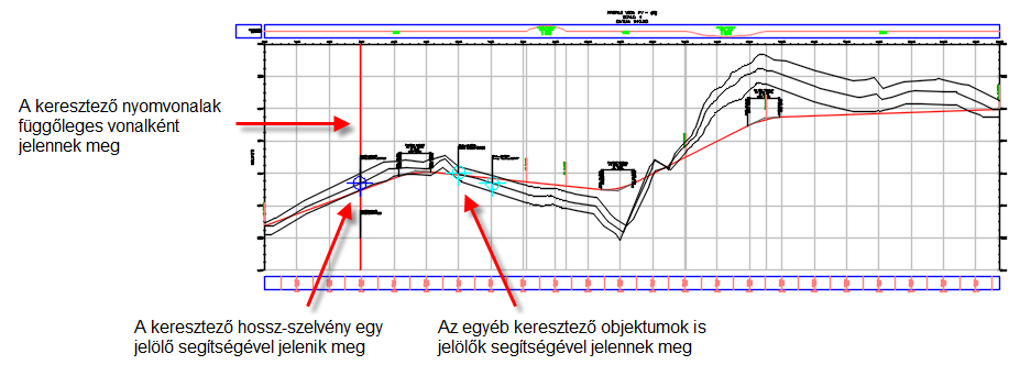 A keresztező nyomvonalak függőleges vonalakként jelennek meg a hossz-szelvény nézetben, mert nem rendelkeznek szintmagassággal, a keresztező nyomvonalak feliratának szintmagassági értékét azonban megadhatja.