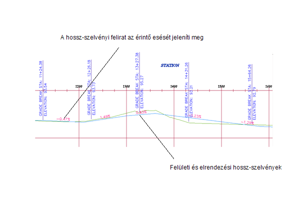 Felületi és elrendezési hossz-szelvényeket megjelenítő hossz-szelvény nézet