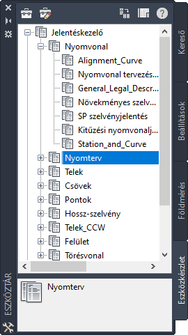Az Eszközkészlet lap minden egyes objektumtípushoz rendezi a jelentéseket. A jelentések tömörített, szállítható formátumban hasznos műszaki adatokat tartalmaznak az egyes rajzokról. Ezek némelyike LandXML formátumú, és előre definiált vagy egyéni XSL stíluslappal rendelkezik. Más jelentések olyan egyéni párbeszédpanelekkel rendelkező .NET programok, amelyek lehetővé teszik az adatok és különböző beállítások megadását.
