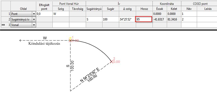 Az alábbi ábrán 95 lett megadva a hossz értékeként, míg a delta szög esetében a 54° 25' 52" számított érték.