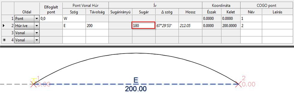 Amikor egy húrív adatait írja be, először meg kell adnia a szöget és a távolságot, majd megadhatja a sugarat, a delta szöget vagy a hosszt. A sugár, a delta szög vagy a hossz közvetlenül megadott értéke hagyományos betűtípussal, míg a kiszámított értékek dőlt betűkkel jelennek meg. Az alábbi ábrán 180 lett megadva a sugár értékeként, míg a delta szög esetében a 67° 29' 53", a hossz esetében pedig a 212.05 számított érték.