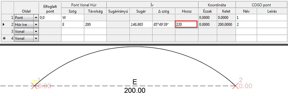 A dőlt betűvel megjelenített értékek is módosíthatók kézzel a többi érték újraszámítása érdekében, miután ez utóbbiak dőlt betűkkel jelennek majd meg. Az alábbi ábrán 220 lett megadva a hossz értékeként, míg a sugár esetében a 146.87, a delta szög esetében pedig a 85° 49' 39" újraszámított érték.