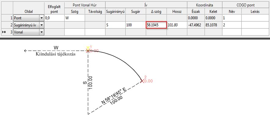 Az alábbi ábrán 58.1945 lett megadva a delta szög értékeként, míg a hossz esetében a 101.80 számított érték.