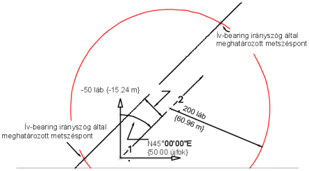 A metszéspontok egy ív, melynek a sugara 200 és a középpontja a 2. pont, és egy 50.0000 irányszög, amely az 1. pontból lett megrajzolva és az eltolása 50 balra, között találhatók.