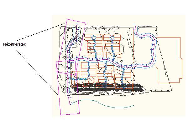Nézetkeretek. A nézetkeretek téglalap alakú területek sorozatai egy nyomvonal mentén, amelyek egy lapon megjelenített területeket határozzák meg. A nézetkeret mérete, alakja és léptéke a hozzárendelt nézetablakból adódik, amely a megadott sablon elrendezés lapján található. A keretek létrehozása után a program a nézetkeret objektumok tulajdonságait az aktuálisan megnyitott rajzban menti el. A rajzban és a Kereső fán megjelennek a nézetkeret objektumok, és a Beállítások fán vezérelhetővé válik az alapértelmezett stílus és a feliratozás.