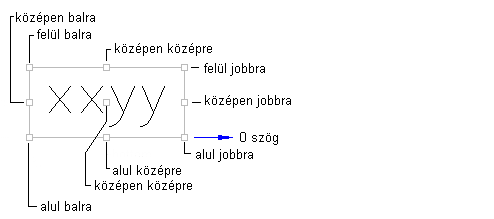 A következő ábra bemutatja, hogyan határozzák meg ezek a pontok a felirat összetevő helyét (az elforgatott szöveget az ábrán):