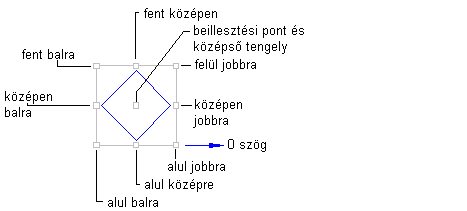 A horgony egy vonalon van (a horgony Alakzatra van állítva és a horgonypont Felirat helyére). A csatolási pont a szövegen Alul balra értékre van állítva. Figyelje meg, hogy az X és az Y távolság, szög és keret hogyan befolyásolják a felirat csatolási- és horgonyponthoz viszonyított elhelyezését.