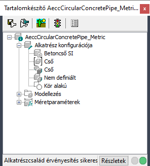 A parametrikus építő környezet megnyitásakor az alkatrész áttekintő legfelső mappája az Alkatrész konfigurációja mappa. Az alkatrész konfigurációja az alkatrész jellemzőit és működését határozza meg a tartomány (cső vagy műtárgy), típus és altípus szerint, és szükséges az alkatrész mentéséhez. Az alkatrész modellezése előtt meg kell határozni az alkatrész konfigurációját, hogy később biztosan érvényes és menthető legyen.