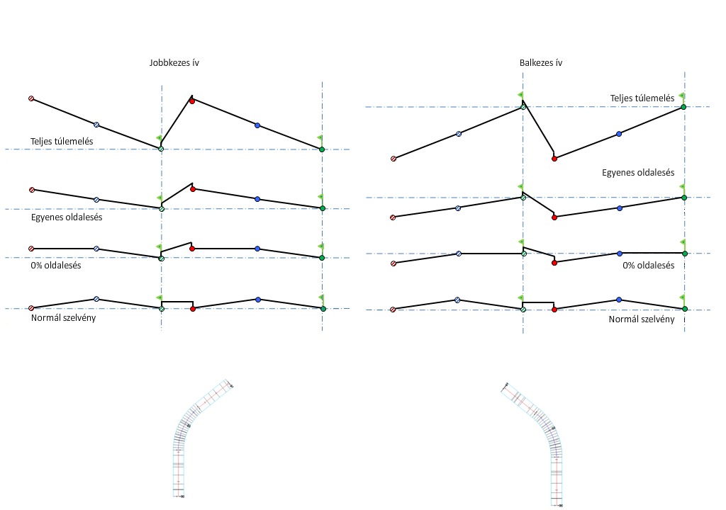 A torzított középvonal azt jelenti, hogy túlemelés alkalmazáskor a középvonal szélessége nem változik, de az egyik oldal megemelkedik vagy lesüllyed, hogy igazodjon a túlemeléshez. Ez a beállítás eltorzítja a középvonal alakját és a