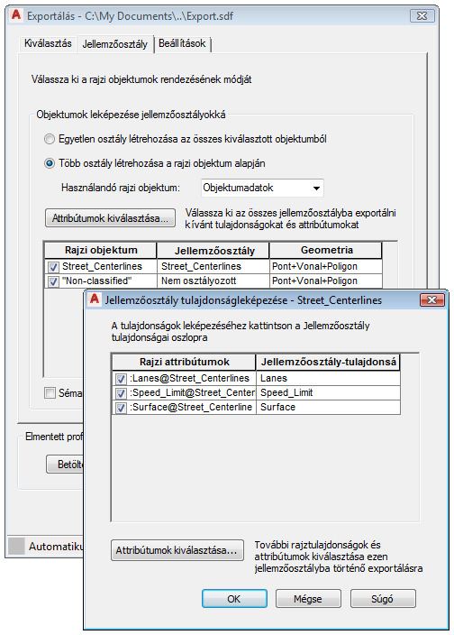 Rajzi objektumok exportálásakor objektumadatokkal hozhat létre jellemzőosztályokat SDF-fájlban. Az eredményül kapott jellemzőosztályok az objektumadat attribútumoknak megfelelő tulajdonságokkal rendelkeznek.