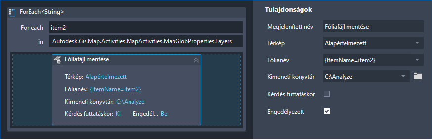 A művelet az aktuális térképben található fóliákat .layer fájlokként menti a megadott mappában