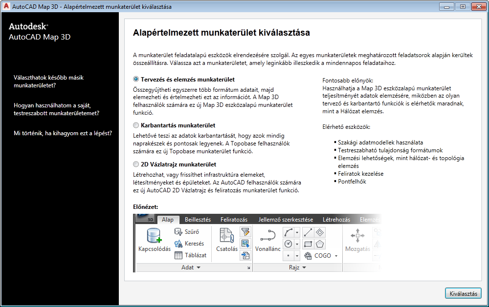 Az AutoCAD Map 3D eszközkészlet előre definiált munkaterületeket tartalmaz. Mindegyik munkatér különbözőképpen rendszerezi és jeleníti meg a parancsokat és eszköztárakat. Az AutoCAD Map 3D eszközkészlet első elindításakor a program felszólítja a kívánt alapértelmezett munkaterület kiválasztására.