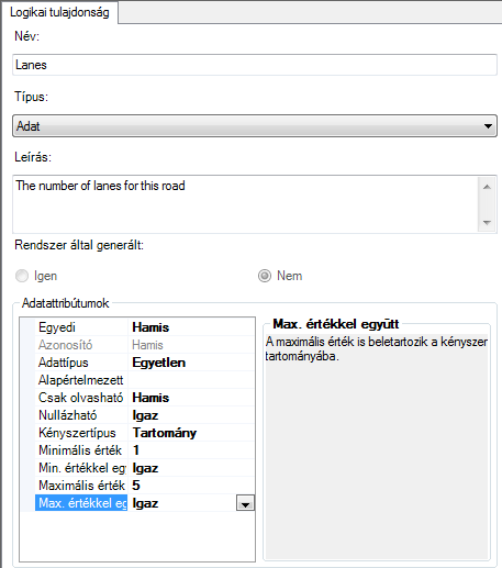 Ezen értékek egy olyan tulajdonságot hoznak létre, amely egy út sávjainak számát jelenti. Az értéknek 1 és 5 (ezen értékekkel együtt) közötti egész számnak kell lennie. Ennek a tulajdonságnak nincs alapértelmezett értéke.