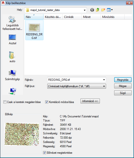 A Korreláció forrása egy világfájl. A fájl neve: REDDING_DRG.tfw. Azon a helyen található, ahová az oktatóanyagok mintafájljait másolta.