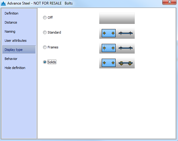 On this tab of the properties dialog box, you can select the way the bolts display in the model.