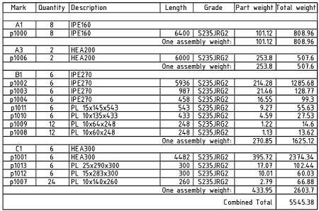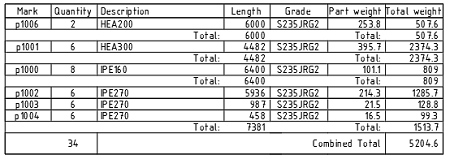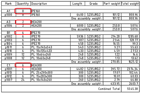 The quantities shown in the list for single parts are total quantities. In case of a partial overview, the quantity displayed in the list for each single part will be the total quantity existing in the model for that part, even if not all these identical objects are present in the view.