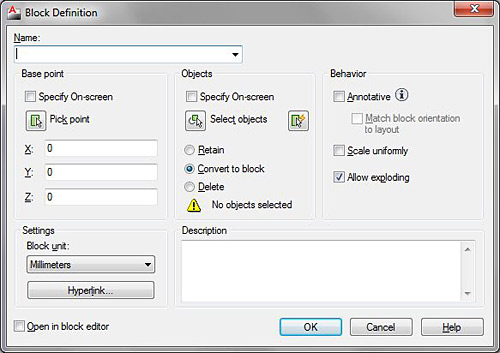 - After the area is defined transform it into an AutoCAD® block with a specific name, recognizable by Advance Steel as a reserved area using the BLOCK command.