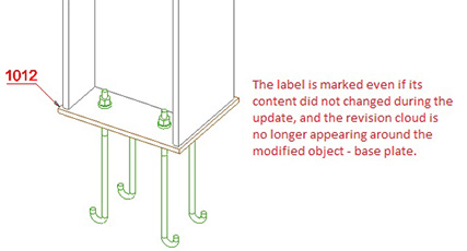 When a drawing is updated with revision, the revision changes can be marked with clouds around the objects that were modified in the model. In addition to the revision marking of the modified object, it is possible to display revisions around dimension lines and labels which change their content during update.