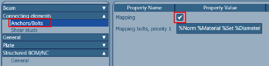 First, turn on the mapping by checking the Mapping default from the Management Tools / Defaults / Connecting elements / Anchors/Bolts.